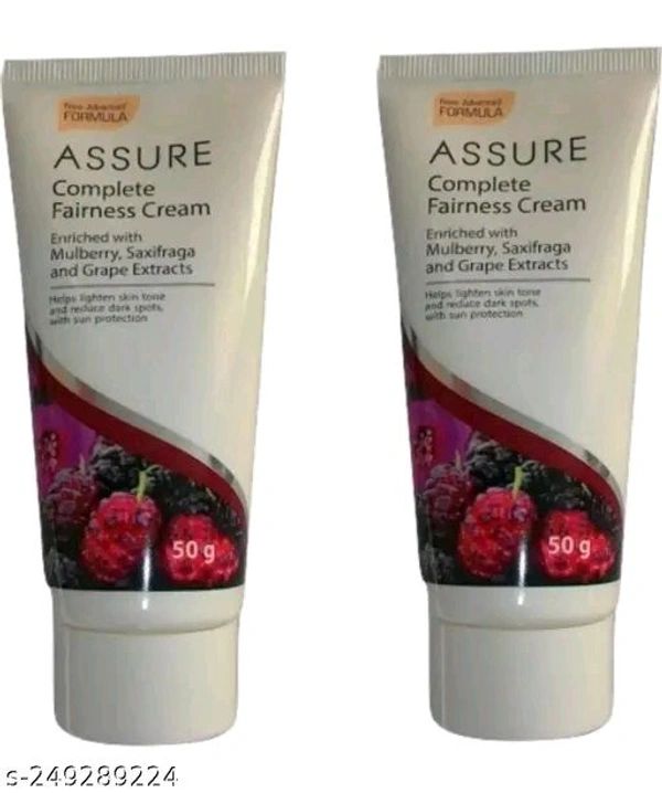 ASSURE Complete Fairness Cream Enriched With Mulberry, Saxifraga And Grapes Extract (pack Of 2)Name: ASSURE Complete Fairness Cream Enriched With Mulberry, Saxifraga And Grapes Extract (pack Of 2)Product Name: ASSURE Complete Fairness Cream Enriched With Mulberry, Saxifraga And Grapes Extract (pack Of 2)Skin Tone: Medium/WheatishShade: 15 FairType: CreamNet Quantity (N): 2Concern: